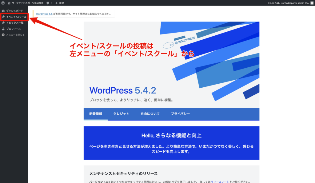 管理画面に入り、左メニューの「イベント/スクール」をクリックし、「新しいイベント/スクール」から新規記事を投稿することができます、