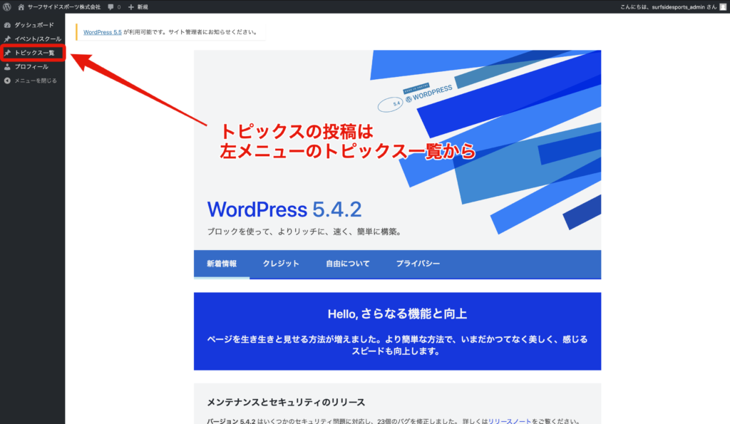 管理画面に入り、左メニューの「トピックス一覧」をクリックし、「新しく追加」から新規記事を投稿することができます、